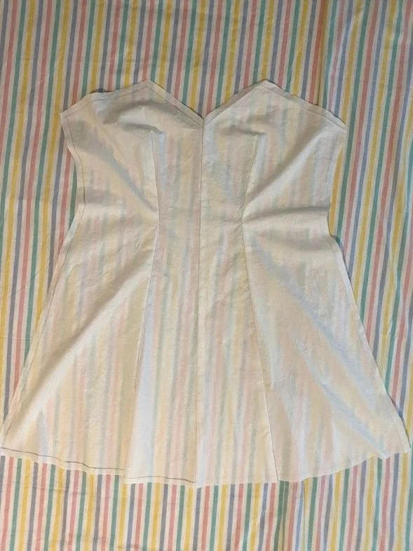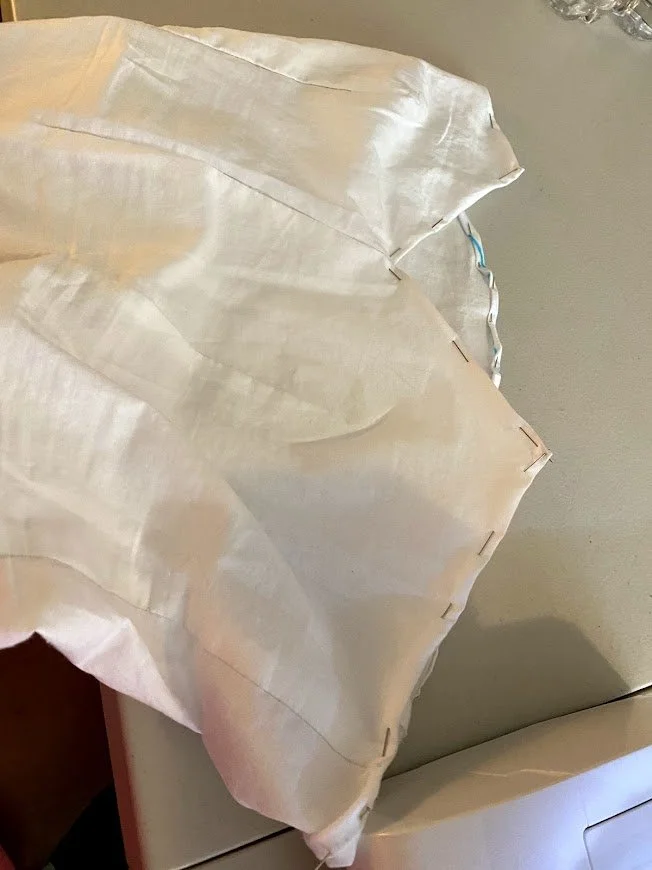 Step 7: I washed and ironed the fabric. I am using bleached muslin for this slip. It isn’t the most flowy of fabrics, but this was just a practice round to learn how to execute this pattern. When I cut out the pattern pieces on the fabric, I realized that the width of the fabric wasn’t long enough to be able to cut out the front piece on a fold of equal pieces, so I had to cut out two pieces and then sew down the center seam of the front